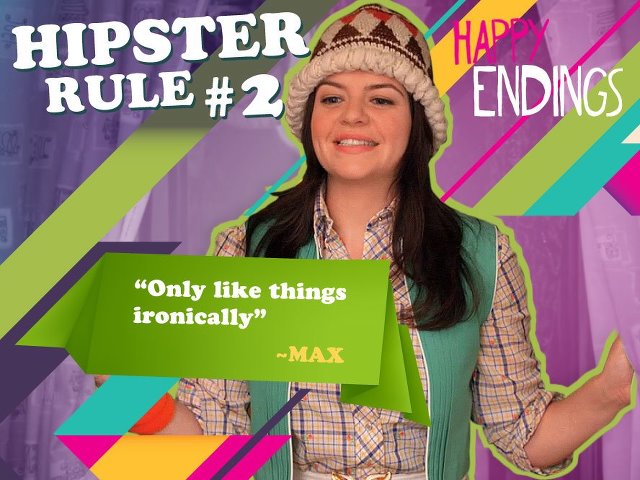 Did any of you see the episode of Happy Endings, where the hilarious Penny mistakenly got into a relationship with a hipster? I say mistakenly, because he picked her up in the Laundromat (do they even exist in the real world anymore? Or is it just in sitcom narratives?) in her laundry day outfit thinking that was the way she normally dressed – ie like a hobo, without a dog on a string. See, apparently that’s attractive to hipsters. What the what?